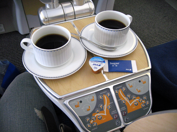 ↑食後のコーヒーも、どこか優雅な気がしますね。ちなみに食器は全てノリタケ製でした。手元のボタン群は座席の電動リクライニングの制御ボタンです。たくさんのボタンがあり、細かいところまで設定することができます。一番下には「マッサージボタン」もあるので、長旅でも疲れませんね!