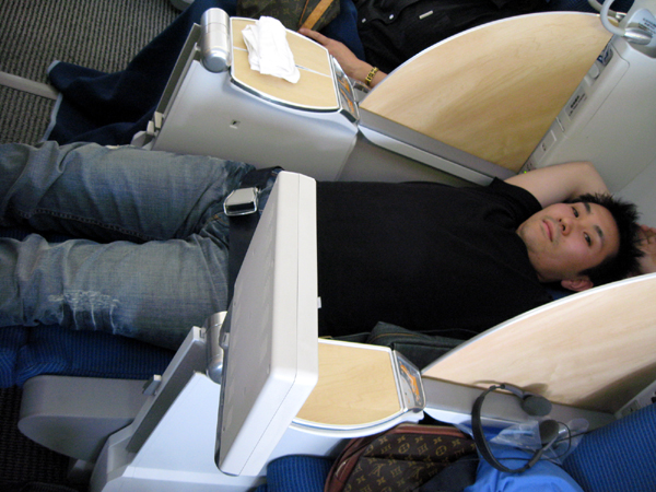 ↑こんな感じで、座席をフラットに近くすることができます。やっぱビジネスクラス最高ですね!