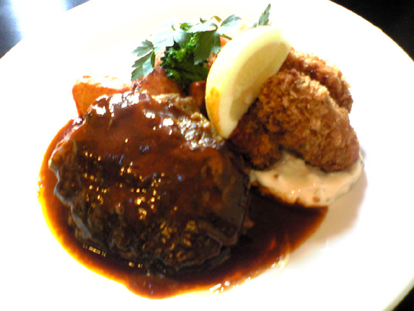 ↑広島産牡蠣のフライとハンバーグのセット。