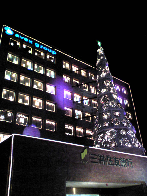スポーツクラブに行く途中、エイベックス・グループの本社ビルがあります。そのエイベックスのビル前に今年も巨大なツリーが飾られていたので、携帯で撮影してみました。