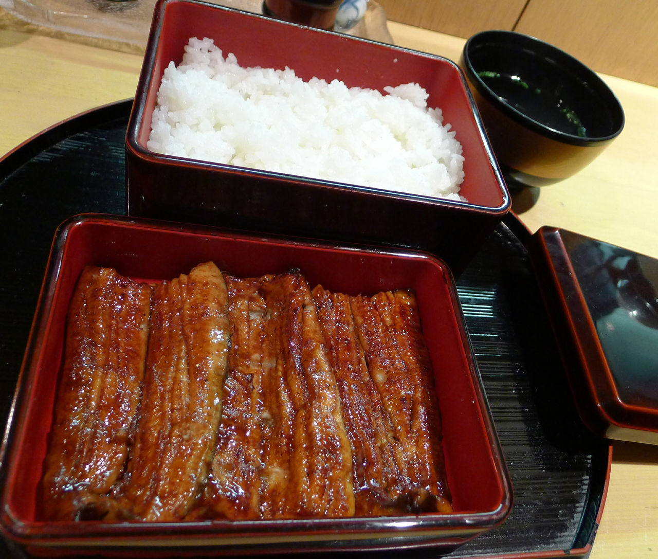 やっと、お重に入ったうなぎとご飯、きも吸が運ばれてきました。うなぎは鹿児島の大隈半島産のものだそうです。大きなうなぎは三枚。