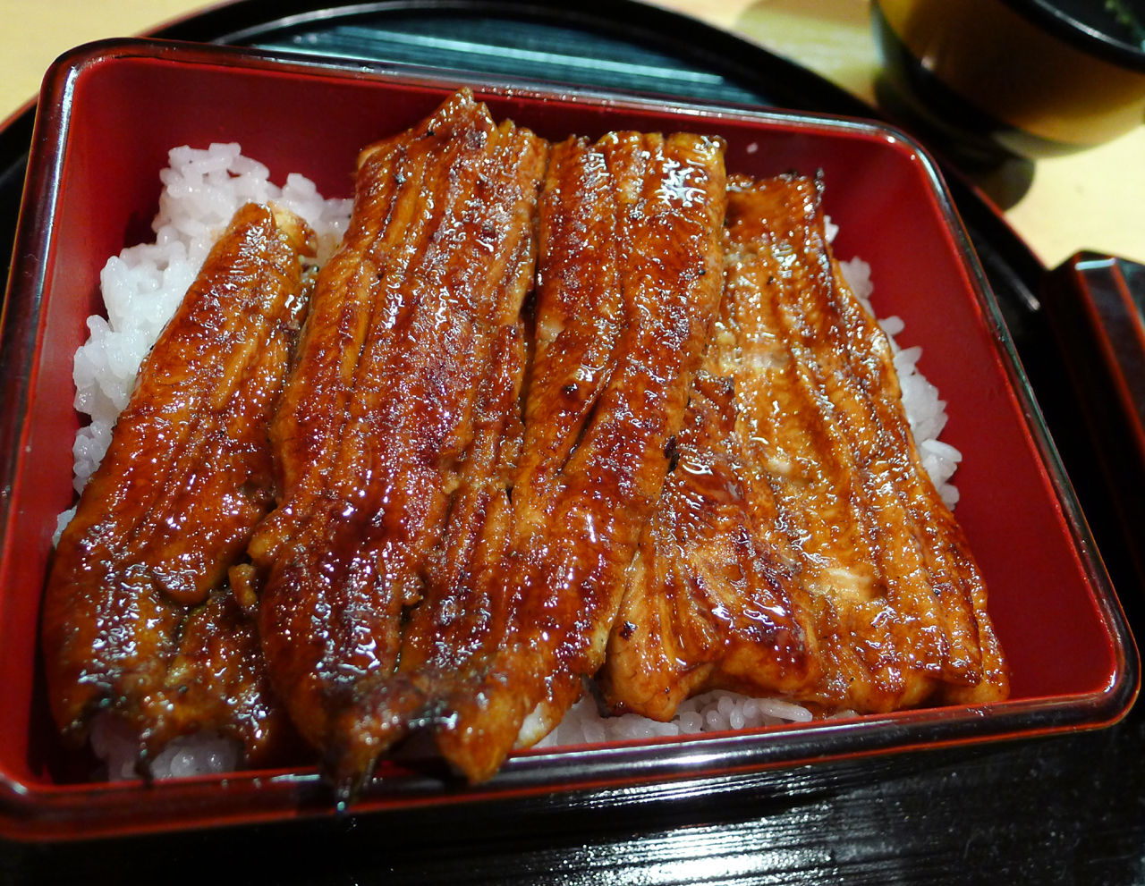 照りもしっかりギラギラしています。このお店でも、うなぎを二段目のご飯にのせ、タレを足して食しました。