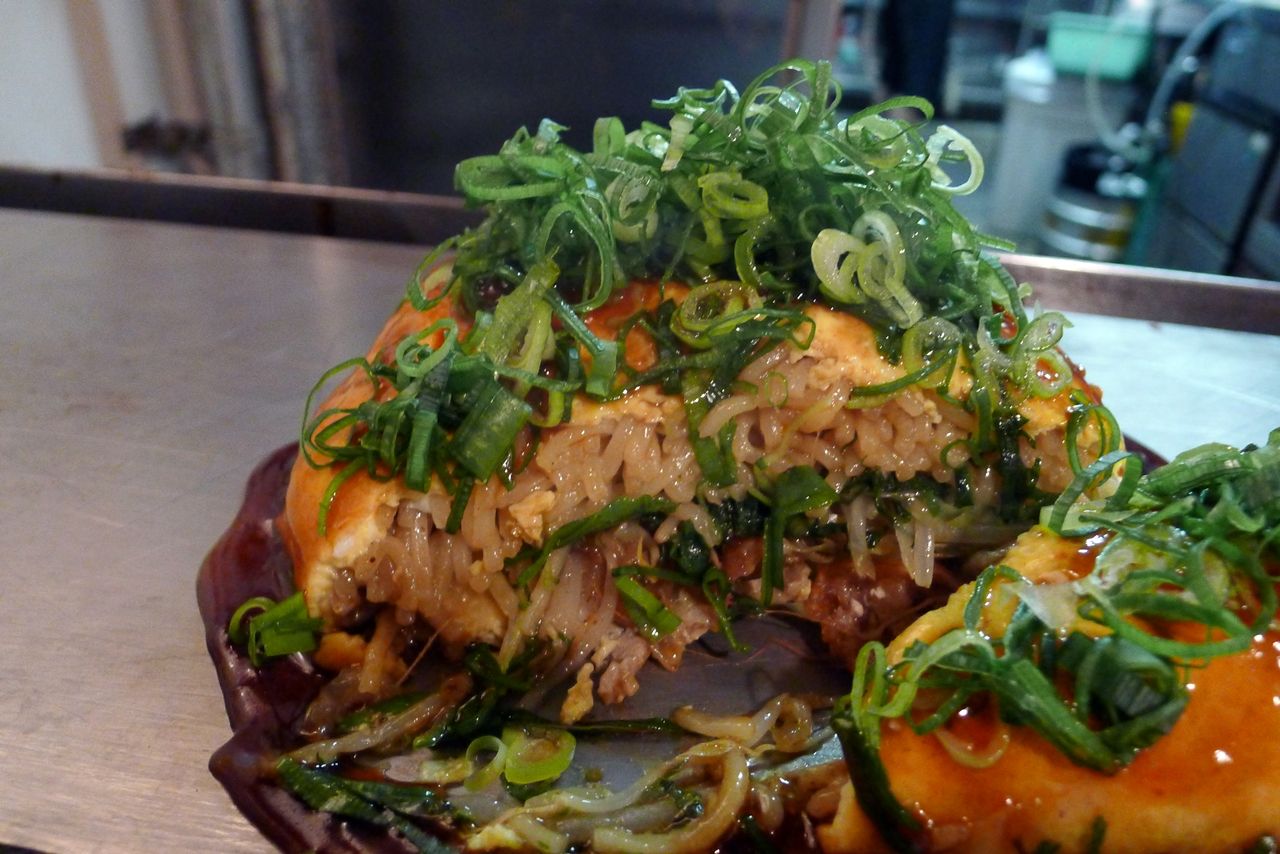 お好み焼きの底はパリパリに焼かれ、上に行くほどモッチリ。ソバとキャベツのバランスが絶妙で、全く飽きがきません。