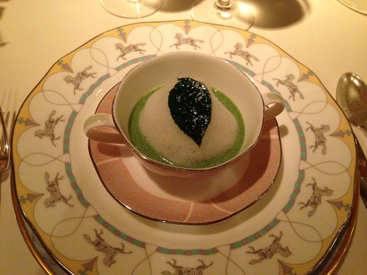 続いて、底にクスクスの入った、モロヘイヤと男爵いものビシソワーズスープ。上にはミルク泡とモロヘイヤの葉っぱが浮いています。