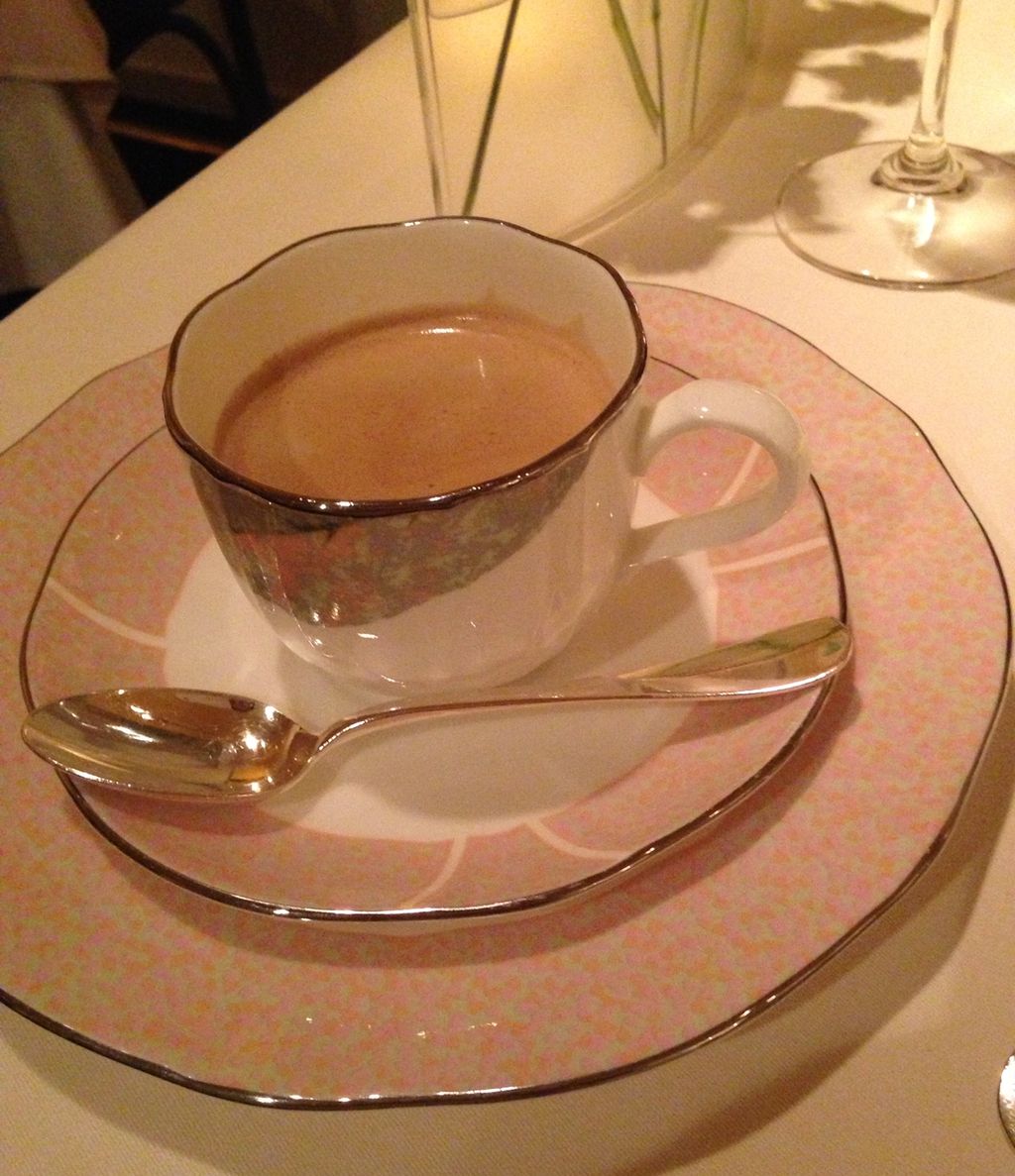 食後はコーヒーにしましたが、コーヒーにもお皿が2枚でゴージャス。こんな大袈裟なコーヒーは始めてです。当然のことながら、コーヒーの味も温度も最高でした。