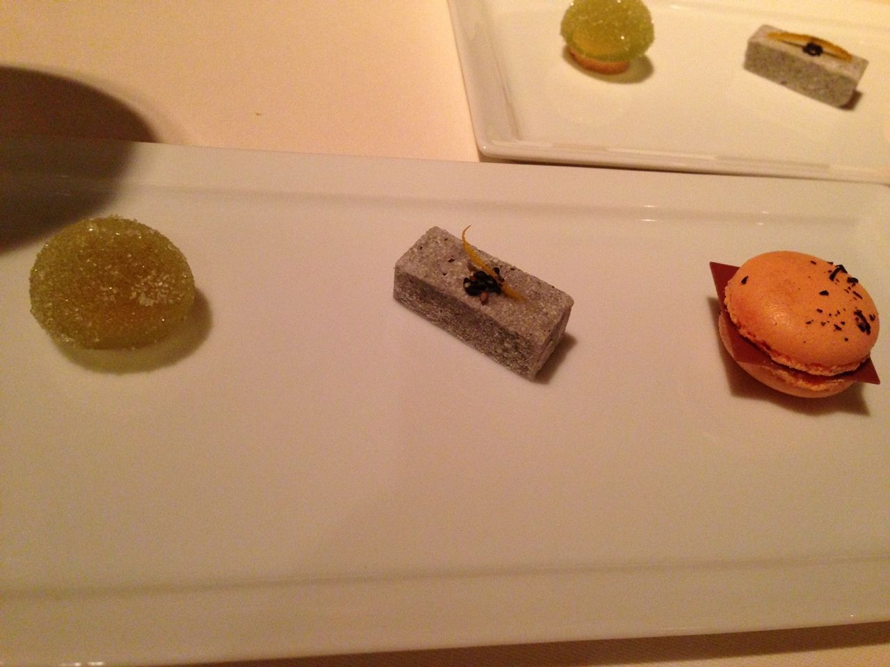 三種とは、青リンゴのグミのようなもの、黒ゴマのギモーブ、メロンと紅茶のマカロンでした。