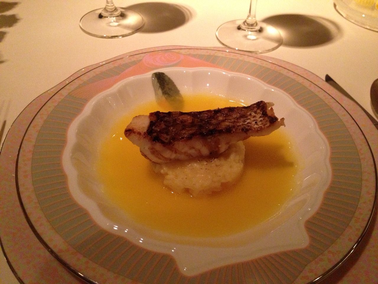 こちらは魚料理。菊さんの実家である愛媛・松山沖の天然鯛のグリエ。鯛の下にはゴールデンビーツのリゾットが敷かれています。