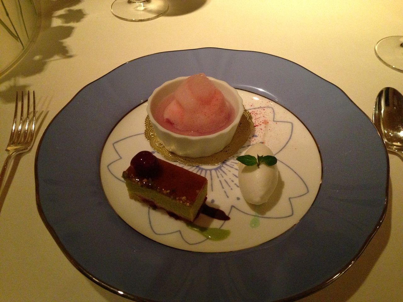 そして、デザート。山梨産桃のスープ、ミントアイス、ピスタチオとグリヨットのケーキでした。