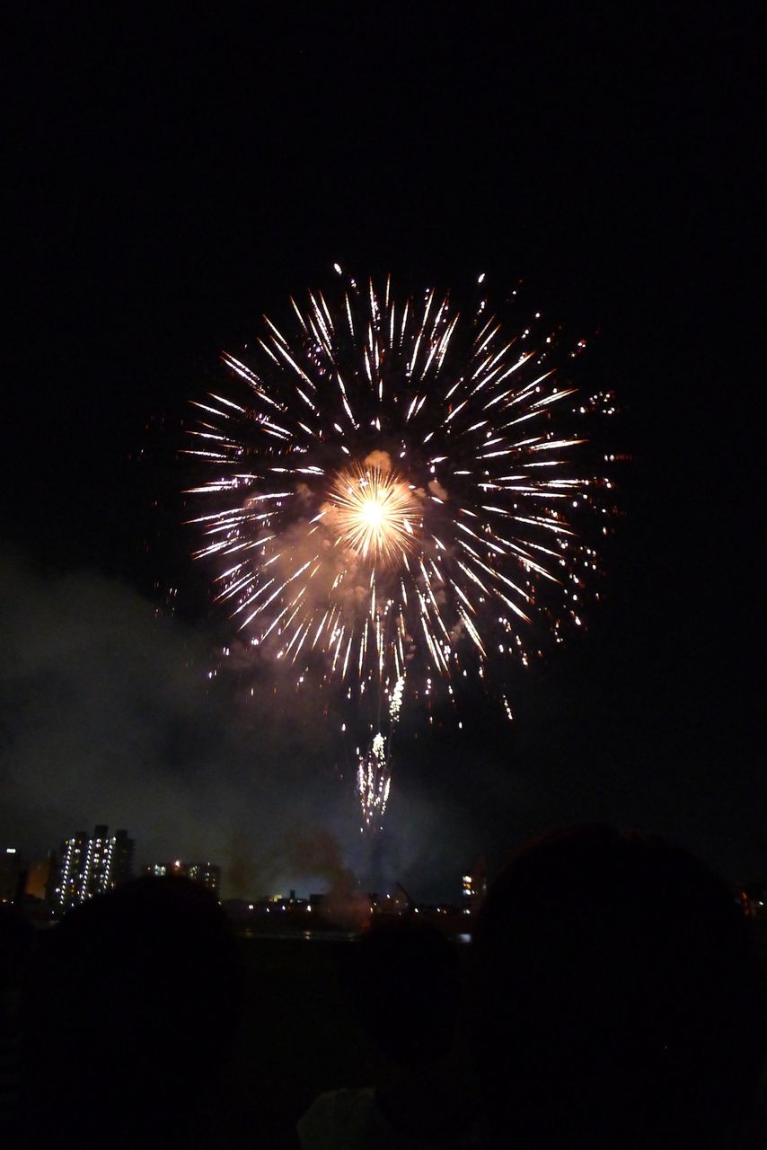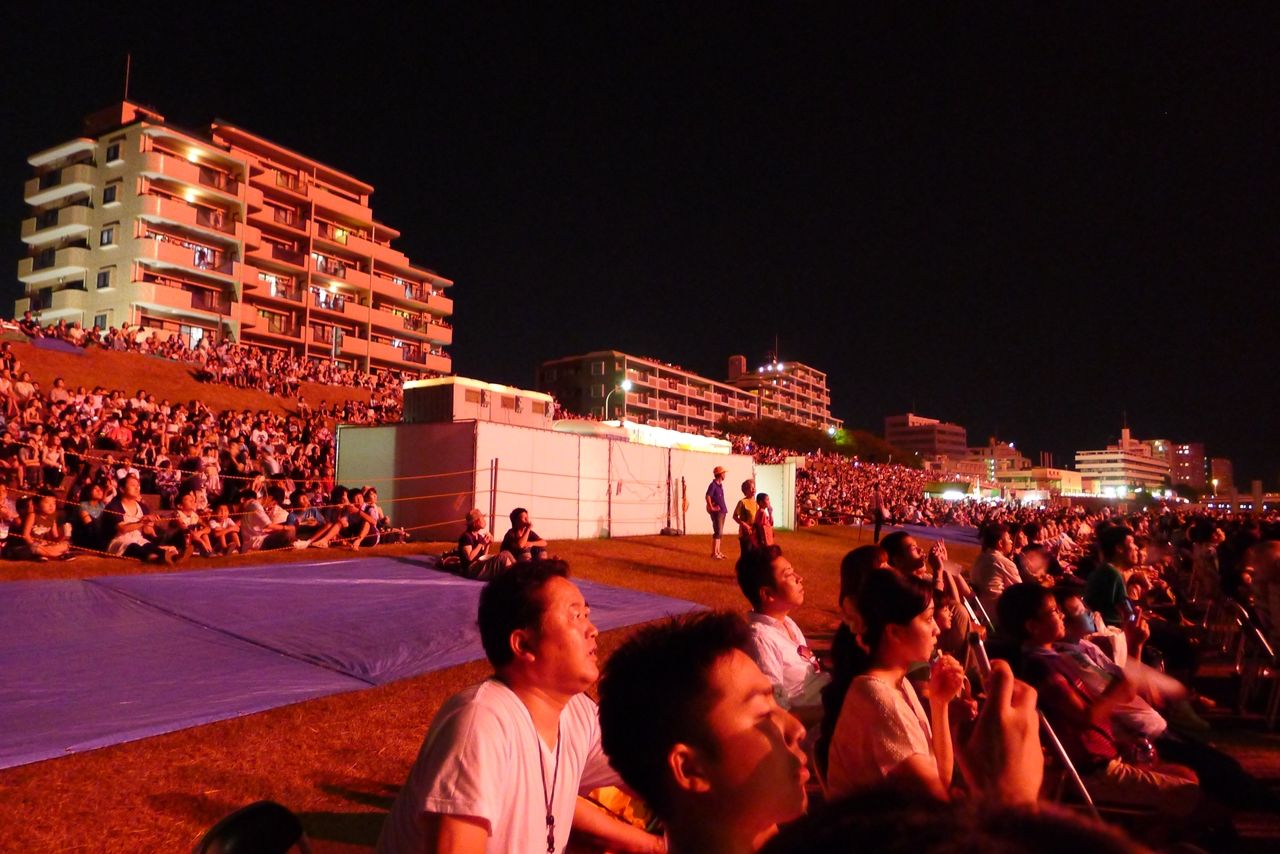 大淀川に浮かべられた台船から花火が打ち上げられます。こんな近距離の打ち上げ花火を見るのは初めてです。