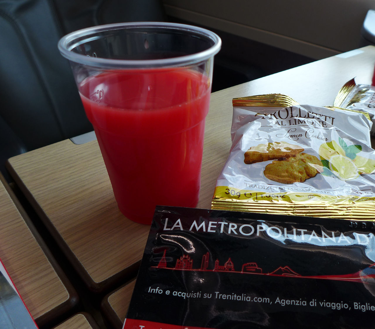 まさか新幹線でドリンクサービスがあると思っていませんでしたが、おしぼりとスナック菓子とドリンクが手渡されます。ジュースはブラッドオレンジにしました。