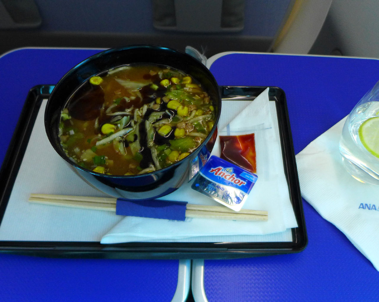 日本到着前まで機内食は選べるメニューの中からオーダーしてくださいとのことだったので、一風堂のコク極まる味噌ラーメンというのを注文しました。ちゃんとコーンも入っています。そして、味噌ラーメンの必需品、コチュジャンとバターも用意してくれました。たしかにコクを感じるスープ!これは日本人として嬉しいです!