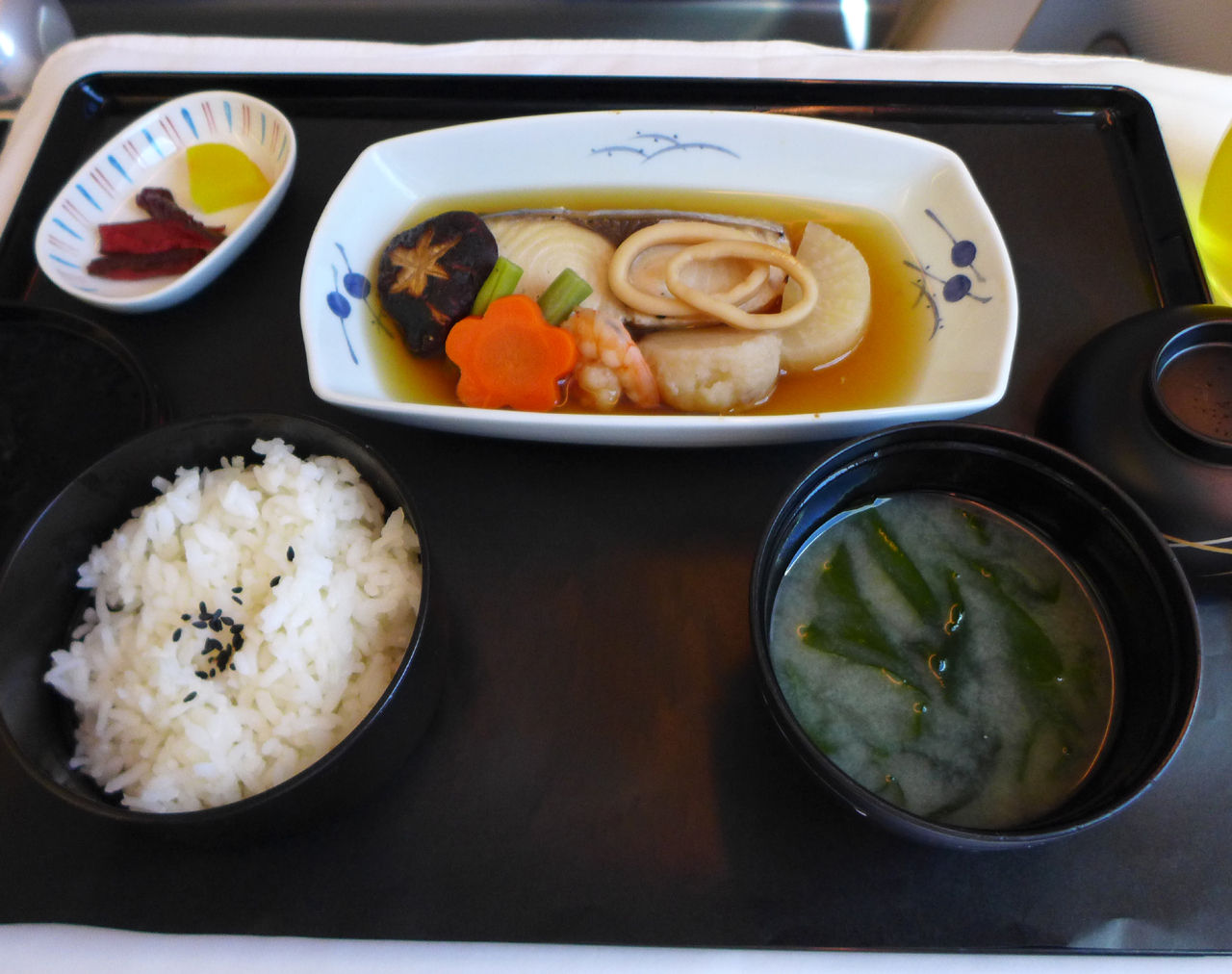 の順番で出てきます。日本のご飯なので、もちろん美味しいけど、、、やっぱりJALの機内の炊飯器で炊いた、炊きたてご飯には劣ります。