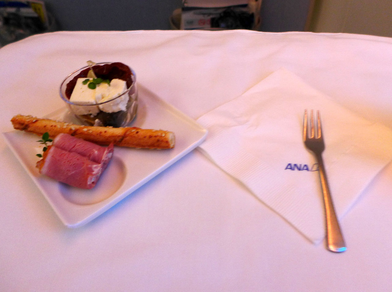 メニューとミネラルウォーターが配られます。ミネラルウォーターはB787に採用されている炭素繊維メーカー東レのロゴ入り。