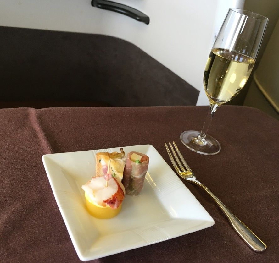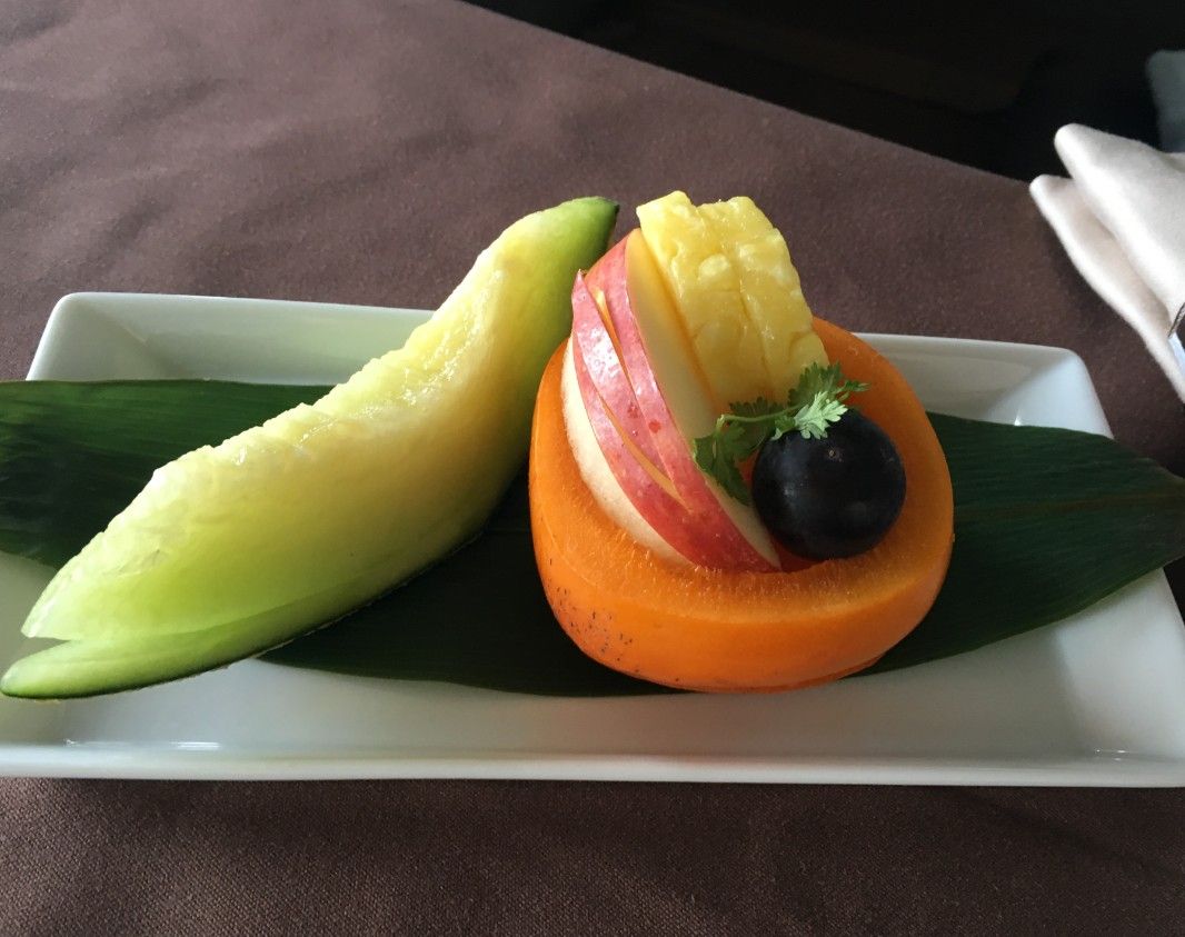食後はしっかり寝て、到着前には果物だけ頂きました。