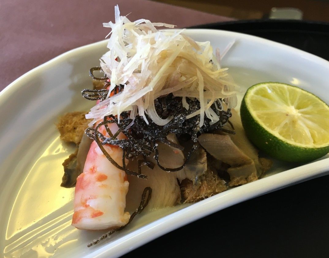 車海老と煮鮑。上に茗荷と塩昆布がのせられています。