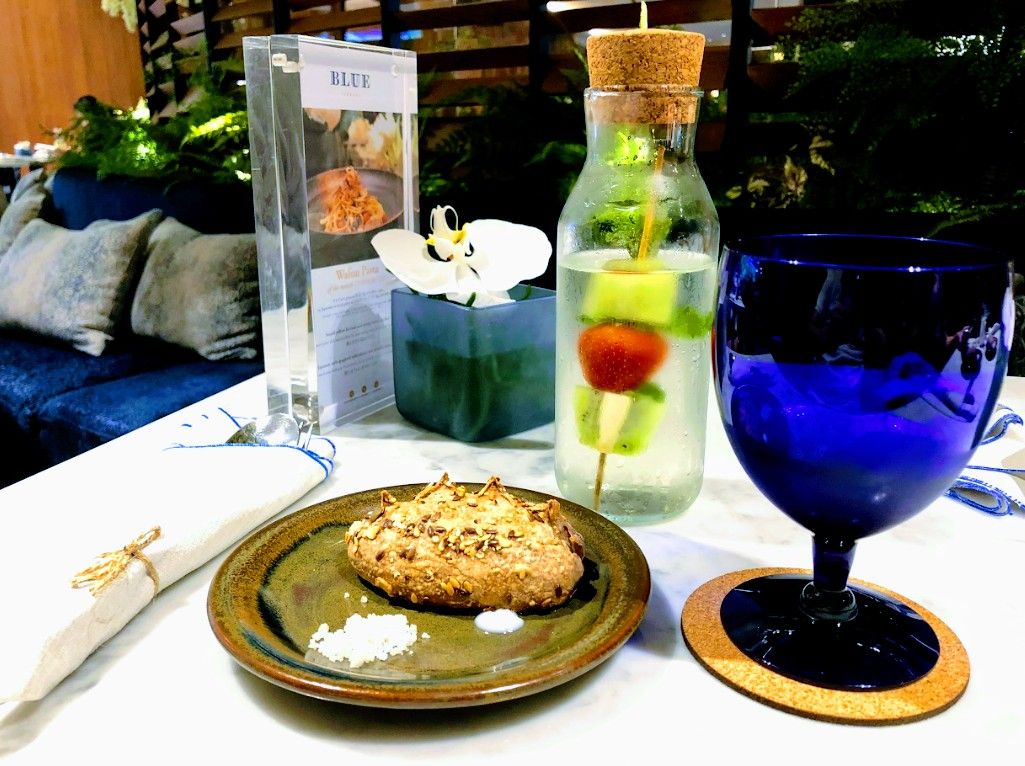 塩で食す焼き立てパン(どうやらグルテンフリーのメニューもあるそうですが)と、オーダーした水です。水は中にフルーツが入っていて、贅沢感あふれる水。。インドネシアであることを忘れてしまいそうです。