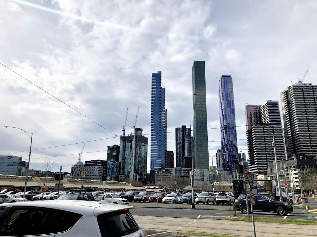 クィーンヴィクトリア・マーケットの先の景色。様々な色に輝く高層ビル群が建ち並んでいます。それにしても、カラフル過ぎじゃないか・・。