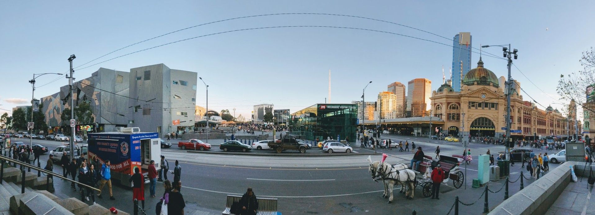 セント・ポールズ大聖堂からフェデレーション・スクエアに向かって撮った写真です。フェデレーション・スクエアの左にはヴィクトリア国立美術館。右にはメルボルンのシンボルフリンダースストリート駅が見えます。
