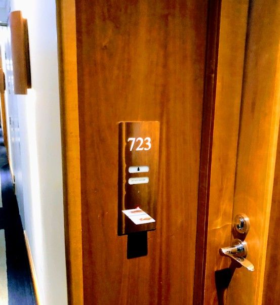宿泊は723号室。通路は広くて長い通路でした。下に降りるエレベーターが奥にもあります。